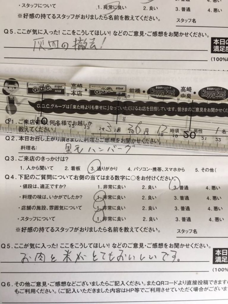 HappyBurg高崎倉賀野店にご来店したお客様から頂いたアンケートです。ありがとうございます。