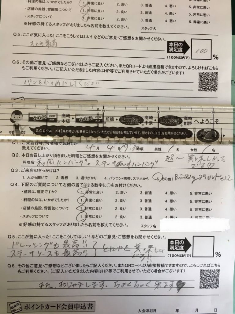 GGC高崎本店にご来店したお客様から頂いたアンケートです。ありがとうございます。スタッフのモチベーションアップになっています。ご来店の際は、アンケートのご記入をお願いします。