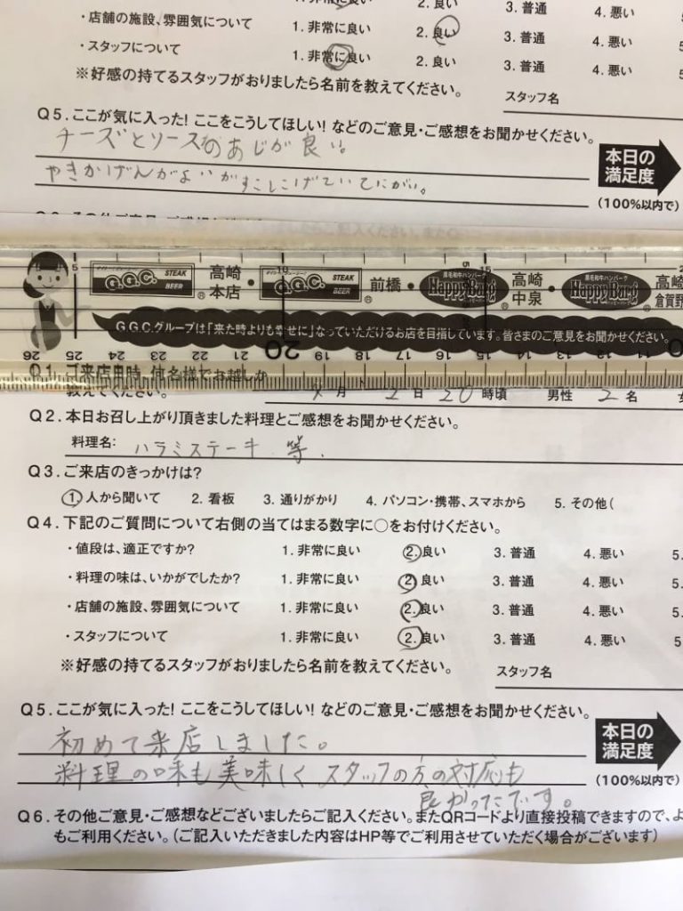 GGC高崎本店にご来店したお客様から頂いたアンケートです。ありがとうございます。 スタッフのモチベーションアップになっています。ご来店の際は、アンケートのご記入をお願いします。 ソーシャルメディアへの投稿は大歓迎です。 「#ggc」「#happyburg」をつけての投稿をお願いします。