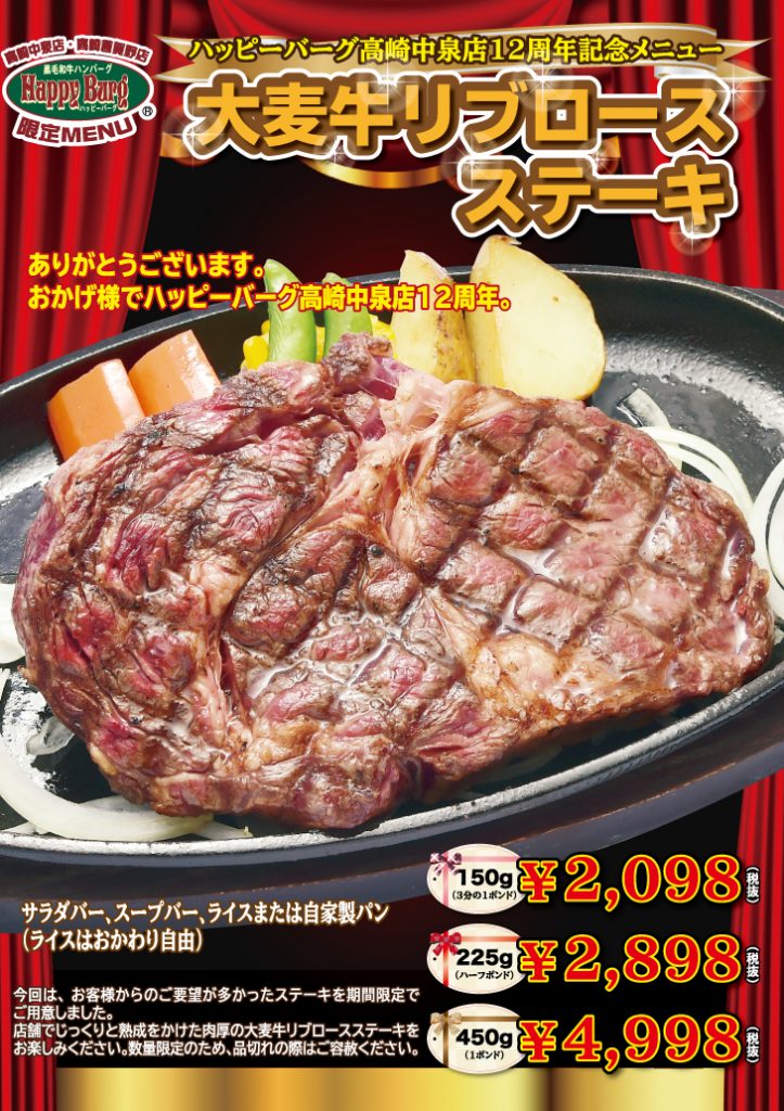 おかげ様で2019年4月でHappyBurg高崎中泉店は12周年!12周年を記念して、お客様からのご要望が多かったステーキをご用意しました!!店舗でじっくりと熟成をかけた肉厚の「大麦牛リブロースステーキ」