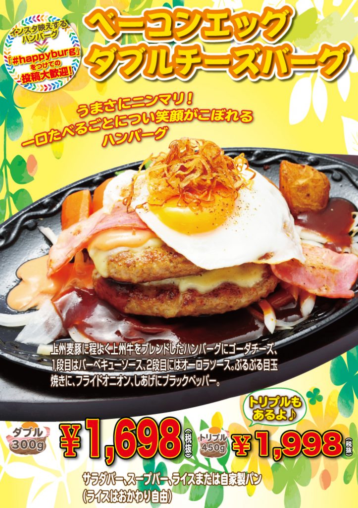 2019年5月HappyBurg高崎倉賀野店・HappyBurg高崎中泉店のおすすめメニューは「ベーコンエッグダブルチーズバーグ」
