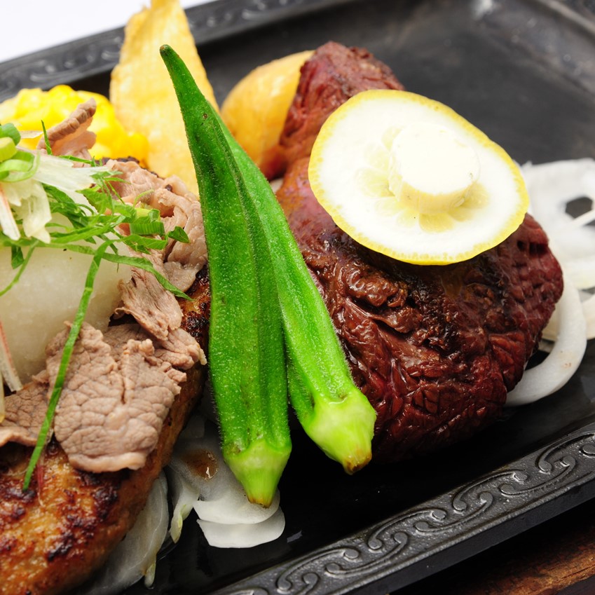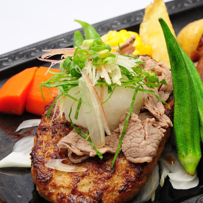 国際基準をクリアした熟成牛ハラミステーキと上州牛&上州麦豚100%ふっくらあいびきハンバーグ180gに牛しゃぶ、大根おろし、みょうが、大葉をトッピング。