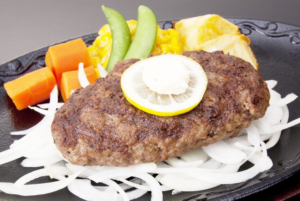 上州牛100%のお肉を自火焼きしたお肉の味をたのしめる「上州牛ハンバーグ」。通常180g→240gでお値段そのまま。