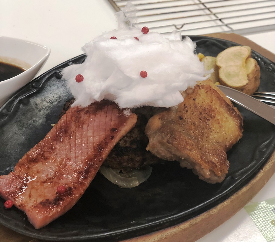 野村さんが考えてくれた「ボリューム満点!ドイツの肉コンボバーグ」をアレンジしました。下の写真は野村さん案。
