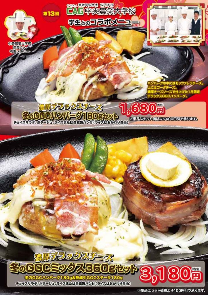中央農業大学校食農調理師学科2年生が考えてくれたメニューを店舗に持ち帰り、さらにブラシュアップ。2020年1月GGC高崎本店・前橋店、HappyBurg高崎中泉店・倉賀野店で販売します。