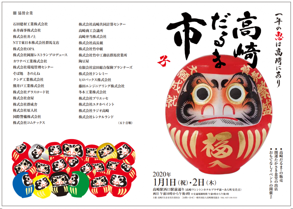 2020年1月1日(水)2日(木)高崎だるま市2020 場所:JR高崎駅西口駅前どおり 時間:10時から16時 に出店します!!