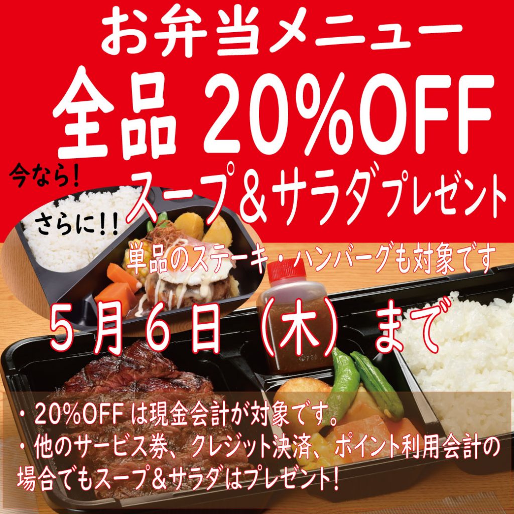 5月6日(水)まで実施のお弁当メニュー全品20%OFFとの併用OKです。現金会計の方が対象です。