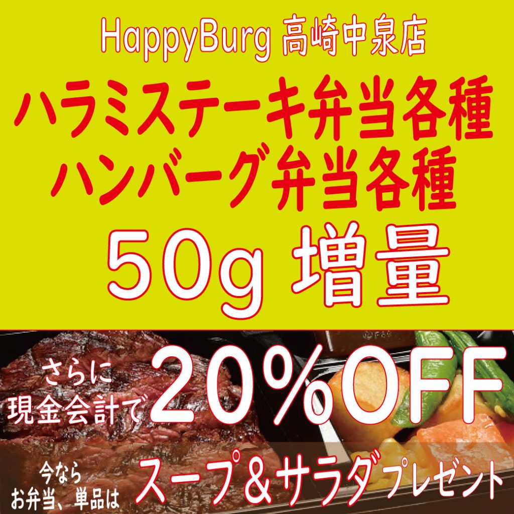 【ハッピーバーグ高崎中泉店限定】ハンバーグ弁当各種50g増量が追加!ハッピーステーキ弁当各種50g増量サービス&さらに現金会計で20%OFF【GWテイクアウトキャンペーン】