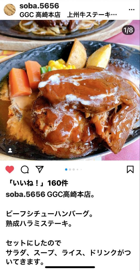 上州牛ステーキとハンバーグ専門店GGC高崎本店にInstagramから口コミをしていただきました。
