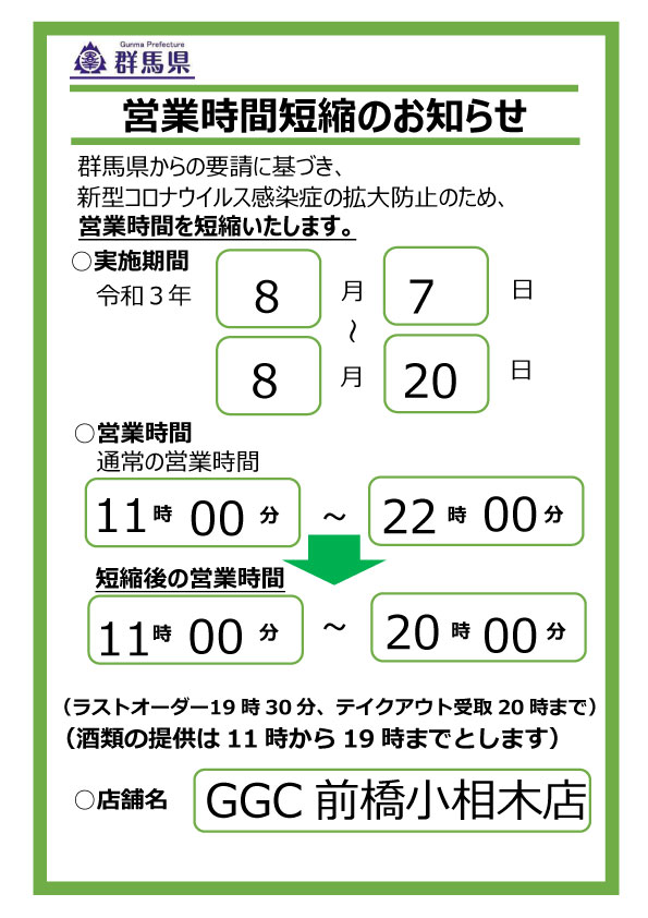 新型コロナウイルス感染拡大防止のための群馬県まん延防止等重点措置のため、GGC高崎本店、GGC前橋駒形店、GGC前橋小相木店、ハッピーバーグ高崎倉賀野店の営業時間を変更します。