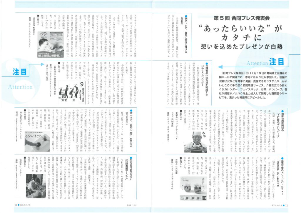 商工たかさき12月号誌面にて、先日開催された第5回プレス発表会に登壇した会社の紹介をしていただきました。