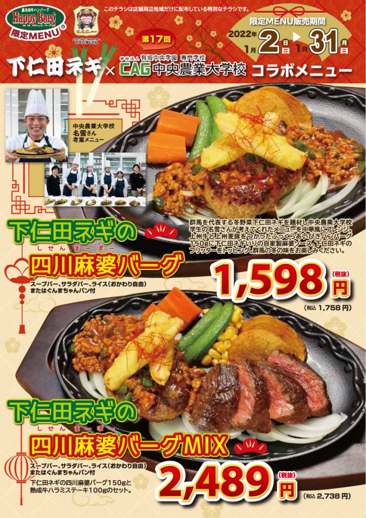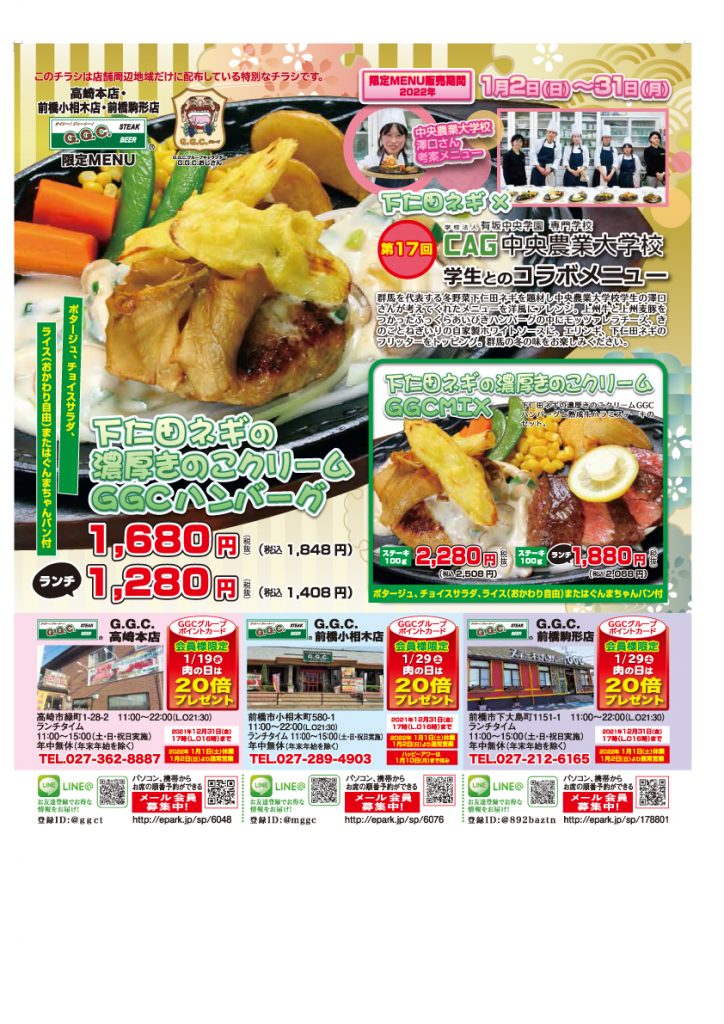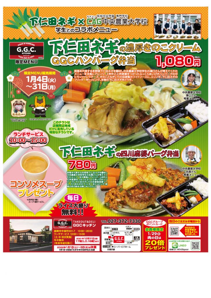 この下仁田ネギ×中央農業大学校×GGCのコラボメニューは、GGCグループ各店で2022年1月の限定メニューとして販売します。
