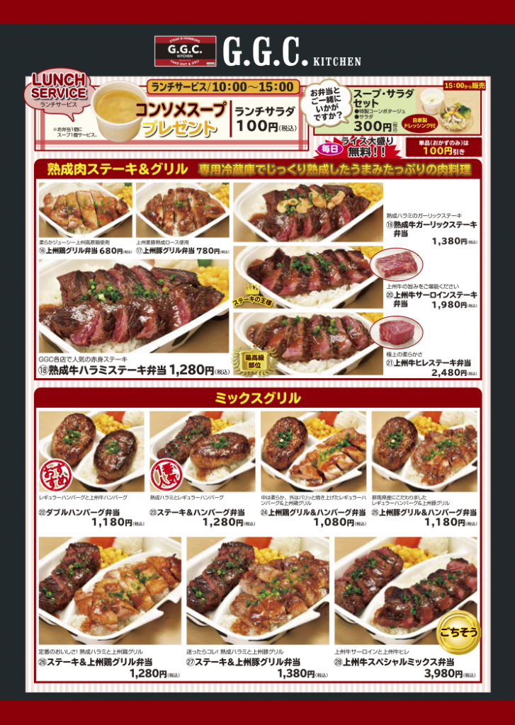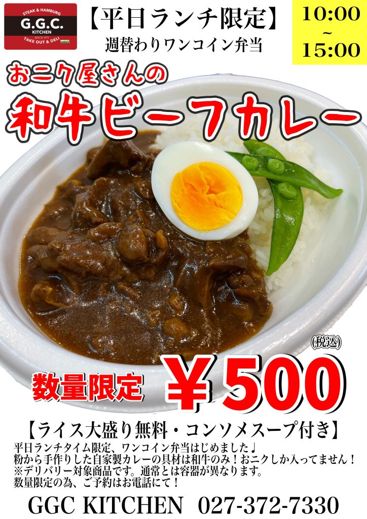GGCキッチンはお肉のお弁当店です。平日限定10時から15時は「ワンコインランチ」を販売中!!