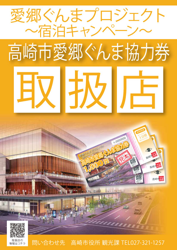 群馬県による「愛郷ぐんまプロジェクト第5弾~宿泊キャンペーン~」の宿泊割引実施に併せて、高崎市では市内の取扱店で使用できる「高崎市愛郷ぐんま協力券」を発行します。