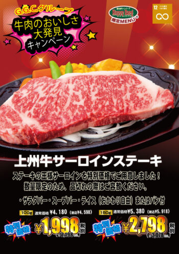 牛肉のおいしさ大発見キャンペーンを開催します!!GGCグループ各店でとってもお得なメニューをご用意しました。シルバーウイークのお食事にご利用ください♪各店も在庫限りの販売となります。品切れ際はご容赦ください。