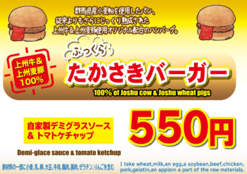 帰れマンデー見っけ隊!でランキング2位のGGCハンバーグと同じお肉、上州牛と上州麦豚をつかったふっくらあいびきハンバーグに自家製ハンバーグソースをかけて、群馬県産小麦粉をつかったパンでサンドしたたかさきバーガー