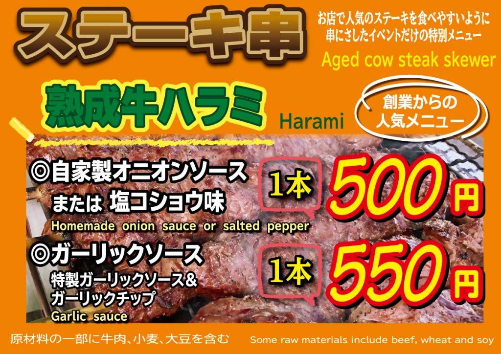 熟成牛ハラミステーキを串にさした大人気のイベント限定メニュー。店舗でたべるよりお得です!