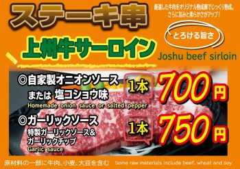 帰れマンデー見っけ隊で紹介されたランキング1位の塾成牛ハラミステーキを串にさした「熟成牛ステーキ串」と「上州牛サーロインステーキ串」
