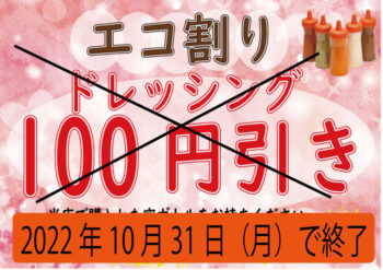 衛生管理、感染症対策の観点から【エコ割り】は2022年10月31日(月)で終了とさせていただきます。