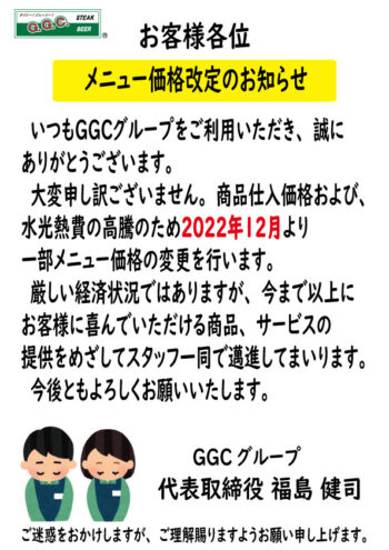 大変申し訳ございません。商品仕入れ価格、水光熱費の高騰のため、2022年12月よりGGC高崎本店、GGC前橋駒形店、GGC前橋小相木店のメニュー価格を変更いたします。