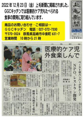 2022年12月23日(金)上毛新聞掲載に掲載していただきました。伊勢崎市のNPO法人「生涯発達ケアセンターさんれんぶ」の中林さまと、お嬢様に重度の障害がある小林一喜さまと、GGCキッチン店長の福島志緒で「誰も外食を楽しむための会」を立ち上げ、医療時的ケア児がたべられる食事の開発をスタート。