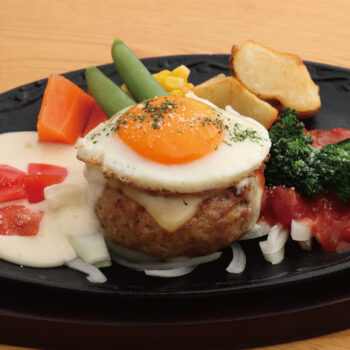 「チーズインフォンデュバーグ」上州牛と上州麦豚をつかったふっくらあいびきハンバーグの中にモッツァレラチーズ、上にはゴーダチーズ、チーズフォンデュソースと自家製トマトソースの2種類のソースにブロッコリー、トマト、ぷるぷる目玉焼きをのせたごちそうハンバーグ。