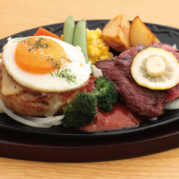 ハラミステーキをのせた「チーズインフォンデュバーグMIX」もご用意。