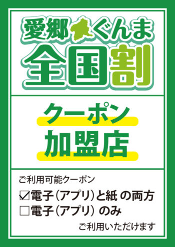 群馬県への旅行で発行される愛郷ぐんま全国割にクーポンは、GGCグループ全店で利用できます。電子、紙のどちらでも利用可能です。