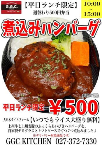 【煮込みハンバーグ】2023年2月20日(月)から2月22日(水)2月24日(金)まで♪ワンコインランチ
