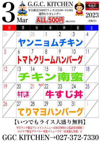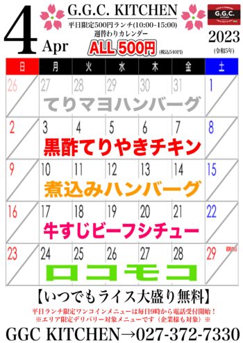 2023年3月27日(月)から3月31日(金)までのワンコインランチは【てりマヨハンバーグ】