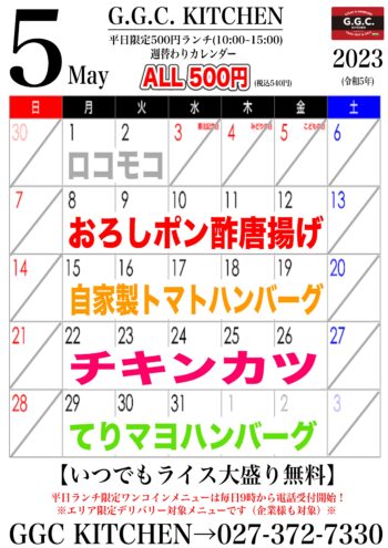 【GGCキッチン】5月のワンコインランチカレンダー