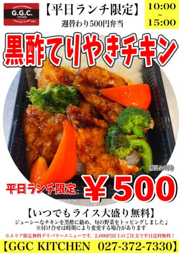 【黒酢てりやきチキン】2023年4月3日(月)から4月7日(金)まで♪ワンコインランチ