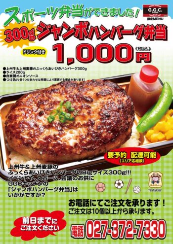 群馬県高崎市にあるGGCキッチンでは、お肉にこだわったテイクアウト専門店を営んでいます。2023年6月のおすすめメニューは、300gの「ジャンボハンバーグ弁当」です。上州牛と上州麦豚をつかったボリュームたっぷりのふっくらあいびきハンバーグ、栄養満点のスポーツ弁当としても最適です。
