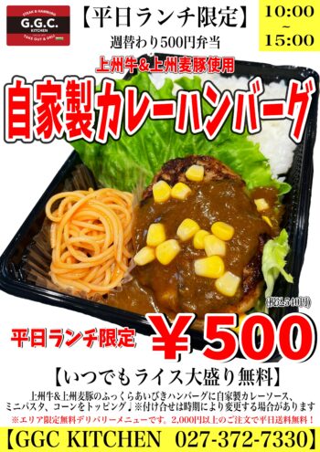 【自家製カレーハンバーグ弁当】2023年6月12日(月)から6月18日(金)平日限定ワンコインランチ
