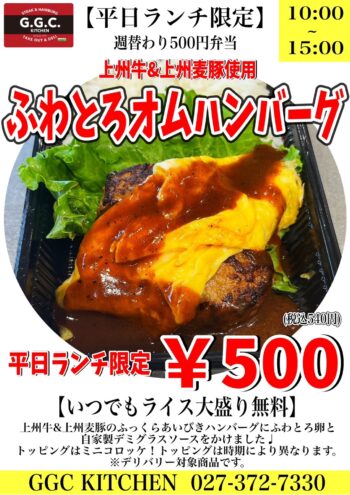 【ふわとろオムハンバーグ弁当】2023年6月26日(月)から6月30日(金)平日限定ワンコインランチ
