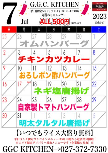 7月のワンコインランチカレンダー【GGCキッチン限定】