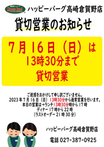 2023年7月16日(日)は13時30分まで貸切営業となります。