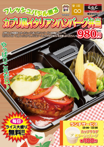 群馬県高崎市にあるGGCキッチンでは、お肉にこだわったテイクアウト専門店を営んでいます。2023年7月のおすすめメニューは、フレッシュバジル薫るカプリ風イタリアンハンバーグ弁当です。