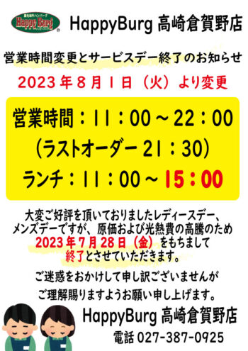 営業時間変更とサービスデー終了のお知らせ【ハッピーバーグ高崎倉賀野店】