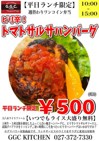 ピリ辛!「トマトサルサハンバーグ」2023年9月4日(月)から9月8日(金)平日限定ワンコインランチ