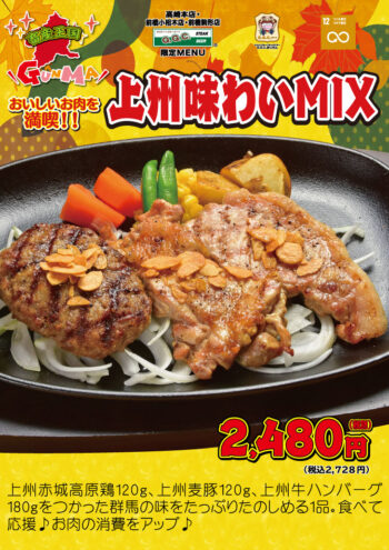 創業1975年、ステーキとハンバーグ専門店で群馬で1番おいしいお店をめざしてるGGCグループはお肉の消費のアップをして群馬県産のお肉のおいしさを知ってもらいたい!と考え、2023年10月のおすすめメニューは「上州牛味わいMIX」をご提供します!