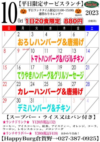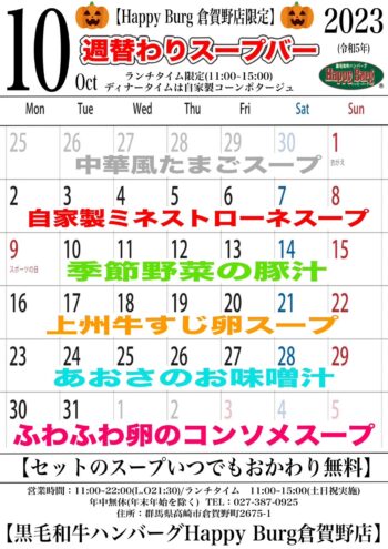 10月のスープバーカレンダー【ハッピーバーグ高崎倉賀野店】
