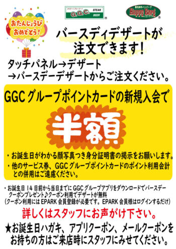 さらにお誕生月にGGCグループポイントカードに新規ご入会でバースデーデザートを半額!でご用意!!