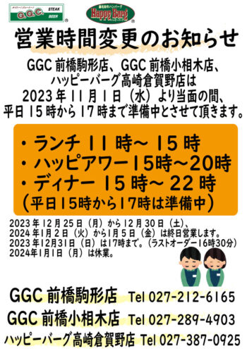 営業時間変更のおしらせ(GGC前橋小相木店/GGC前橋駒形店/ハッピーバーグ高崎倉賀野店)