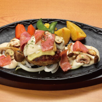 「冬のハッピーバーグ」スープ、ライスまたはパン付き。2023年8月にリニューアルしたハッピーバーグが、冬季限定で新たな姿に変身しました。上州牛と上州麦豚のあいびきハンバーグに、モッツァレラチーズ、ゴーダチーズ、ホワイトソースをトッピング。しめじ、ブラウンマッシュルーム、ベーコンも加え、贅沢な味わいをお楽しみください。
