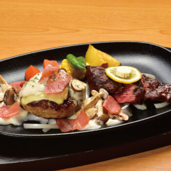 「冬のハッピーバーグMIX」スープ、ライスまたはパン付き。冬のハッピーバーグと熟成牛ハラミステーキのセットもご用意しています。熟成牛ハラミステーキはGGCグループ自慢の熟成庫で1週間以上熟成させています。この熟成過程で肉の組織が緩み、より柔らかさと風味が増しています。焼き加減も絶妙に仕上げられ、ジューシーさと肉の旨味が口いっぱいに広がります。一口食べれば、肉の贅沢な旨味と舌触りの良さに感動することでしょう。