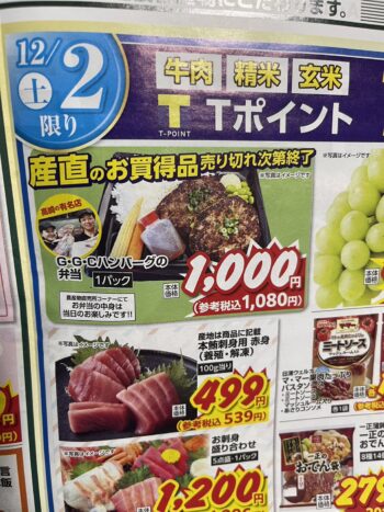 毎週日曜の販売してた特売弁当¥1,000(税込¥1,080)ですが、今週は本日2023年12月2日(土)に販売♪