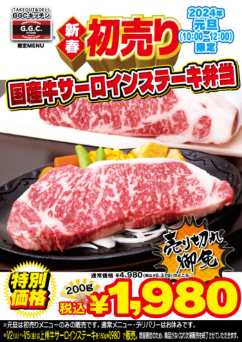 新年の幕開けにふさわしい極上の味わいを、GGCキッチンの特売弁当でお楽しみください!当社自慢の熟成庫でじっくりと熟成した国産牛サーロインステーキ。ジューシーで柔らかなステーキの旨みに舌鼓を打ちながら、新たな年を迎えましょう!