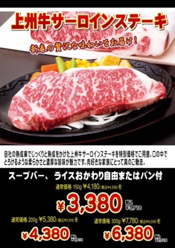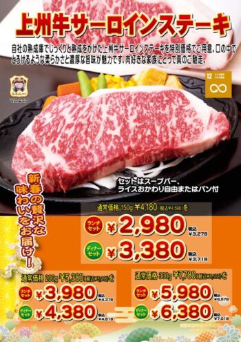 2024年1月のGGC前橋駒形店、GGC前橋小相木店、ハッピーバーグ高崎倉賀野店のおすすめメニューは「上州牛サーロインステーキ」