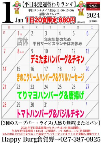1月の週替わりランチカレンダー【ハッピーバーグ高崎倉賀野店】
